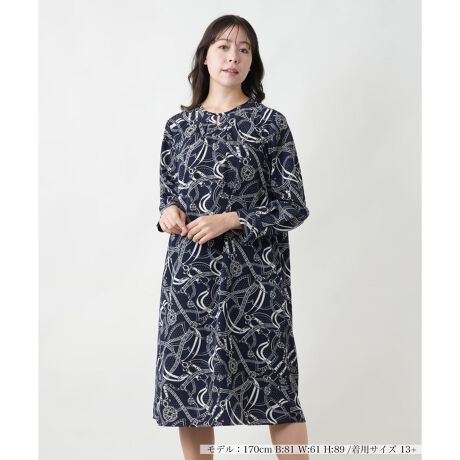 エレガントなプリントが目を引く長袖ワンピース。