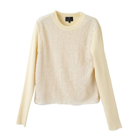 シンプルなクルーネックと長袖のシルエットながら、キラキラと輝くディテールがエレガントな雰囲気を演出します。袖と背面は柔らかなニット素材で仕立てられ、快適な着心地を提供。上品なイエローカラーが優しい印象を与え、フォーマルな場面はもちろん、カジュアルな装いにもアクセントを加える一枚です。
