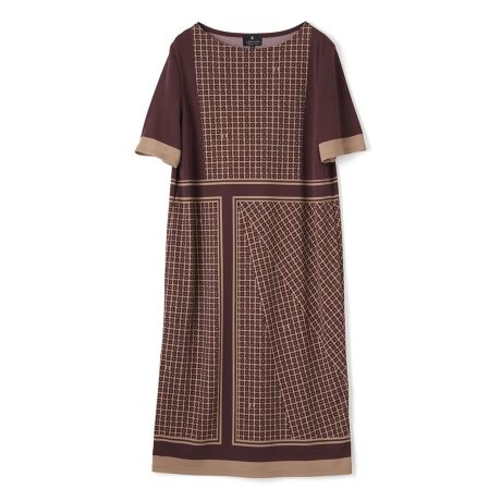モノトーンでまとめられたブロックが広がる、モダンなスカーフを纏った様なワンピース。所々にブランドロゴが隠れているオリジナルプリントです。ウエストの切り替えと、スカートには折り重なる様なデザインが施された、一枚で存在感のあるアイテムです。