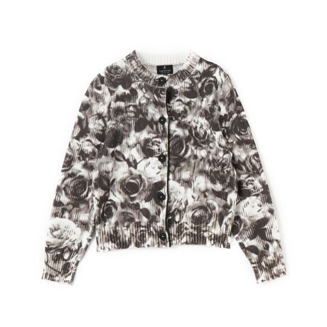 繊細なローズ柄が全面にあしらわれたエレガントなデザインのカーディガンです。