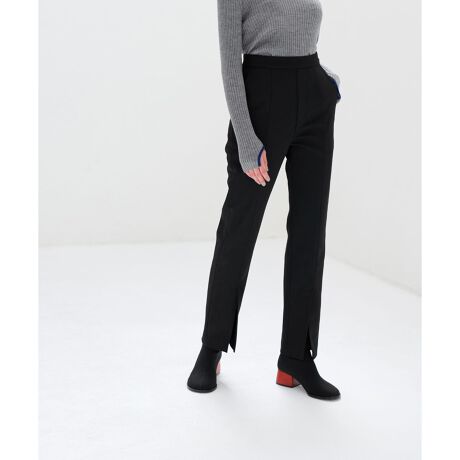 フロントヘムにセンタースリットを配した、軽やかさのあるデザインが魅力的なスリムパンツ。ノータックのミニマルなデザインがコーデを選ばずに取り入れやすいアイテム。ショートブーツと合わせても上品さのある足元に。