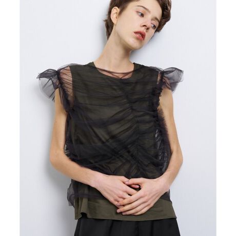 アシンメトリーにあしらったフリルやギャザーで、チュールでも甘すぎない、モードなニュアンスが楽しめるブラウス。
