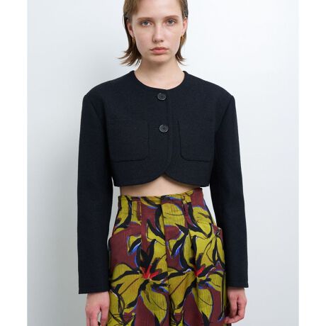 クラシカルなアイテムはショート丈が新鮮。メランジツイードクロップドジャケット