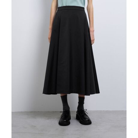 腰まわりの控えめなフレアから裾に向かってアシンメトリーに広がるデザインで、しっかりとした生地感ながらボリュームが出すぎずすっきりとした印象。