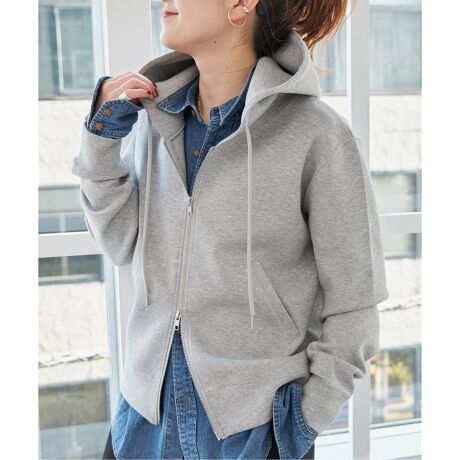 程よいハリ感で、立体的なシルエットが際立つストレッチジップフードパーカー。
