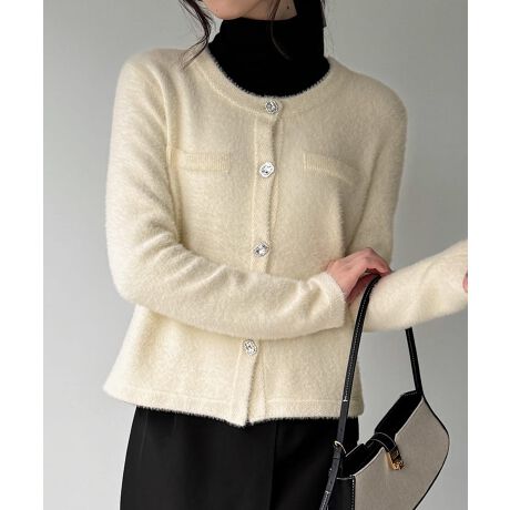 ビジュー釦シャギーノーカラーニットカーディガン