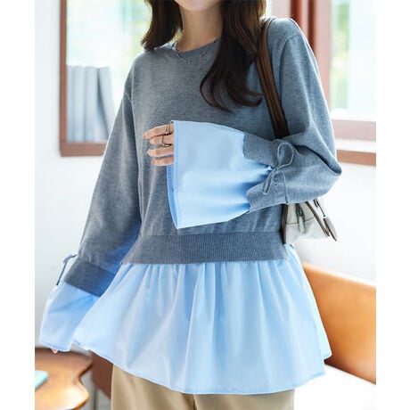 薄手のニットと程よくハリ感のあるシャツ素材のドッキングデザイン。