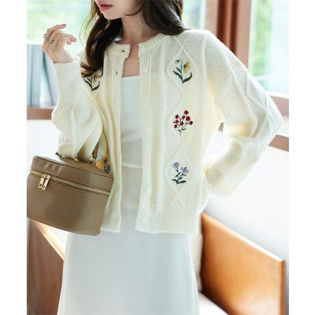 [型番:N1236]ヴィンテージ感ただようケーブルニットカーディガン。繊細な花柄刺繍に編地の柄デザインが暖かみのあるシーズンライクな表情に。カーデとしてもニットトップスとしても着回せるクルーネックニットです。【素材・サイズ感】春先まで使えるローゲージニット。ゆったりとしたサイズ感にぽわんとボリューム感のあるロングスリーブが華奢な女性らしさを演出。カジュアルボトムとも相性よく上品な雰囲気を引き立ててくれるデザイントップスです。#コウベレタス