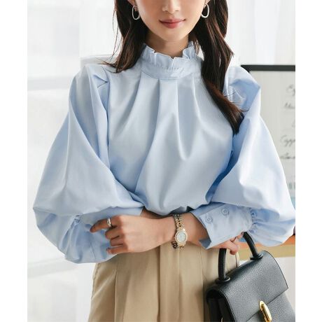 首元のさりげないフリルとふんわりとしたスリーブが女性らしさを引き立てながら、気になる体型もさりげなくカバーしてくれます。