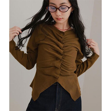 ・フロントのギャザーが印象的なニット・ウエストラインに沿ったギャザーで、スタイルアップ効果も◎・フロントのくるみボタンがさりげないアクセントに。・リラックス感のあるシルエットに、ほんのりクラシックな雰囲気をプラスしました[型番:RGXX1256]