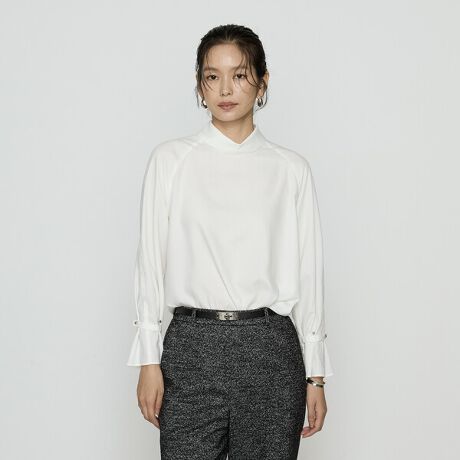 上品なロールカラーとボリューム袖が特長のブラウスで、ハイネックのブラウスもロールカラーの後ろはシャツ襟にすることできちんと感を出しコムサらしいデザインです。