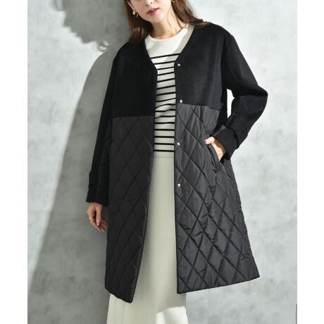 [型番:23163033]大人カジュアルスタイルに決まるハイブリットコート軽量で暖かなキルティングと高見えするシャギー素材をハイブリット。ウエスト切替でスタイルアップ効果も期待できます。顔回りをすっきり演出しくれるカラーレスとクラス感ある袖口のタブディティールが◎タートルやパーカーフードを出したカジュアルなスタイリングにも良く合います。ロング丈でシンプルなスタイルに羽織るだけで様になるお勧めなアウターです。