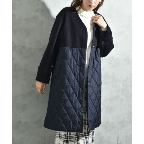 [型番:23163033]大人カジュアルスタイルに決まるハイブリットコート軽量で暖かなキルティングと高見えするシャギー素材をハイブリット。ウエスト切替でスタイルアップ効果も期待できます。顔回りをすっきり演出しくれるカラーレスとクラス感ある袖口のタブディティールが◎タートルやパーカーフードを出したカジュアルなスタイリングにも良く合います。ロング丈でシンプルなスタイルに羽織るだけで様になるお勧めなアウターです。