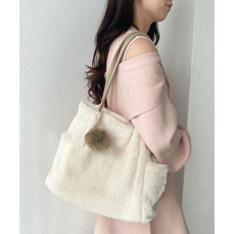 ふんわりとしたフェイクファー素材に、タックを寄せた丸みのあるフォルムが可愛らしいトートバッグ。