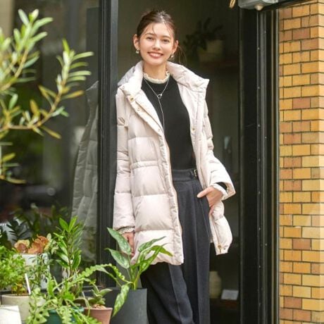 キレイ目にもカジュアルにもこなせるミドル丈のダウンコート。