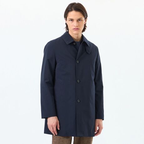 キルトライナー付きのステンカラーショートコート。控えめなAラインで英国らしさを追求したシャープなシルエットが特徴です。襟タブ付きのデザインで脇下にはフラットハトメのべンチレーション付きでモダンな印象です。キルトライナーの背中部分にハウスチェックを使用し、英国らしさを演出しています。
