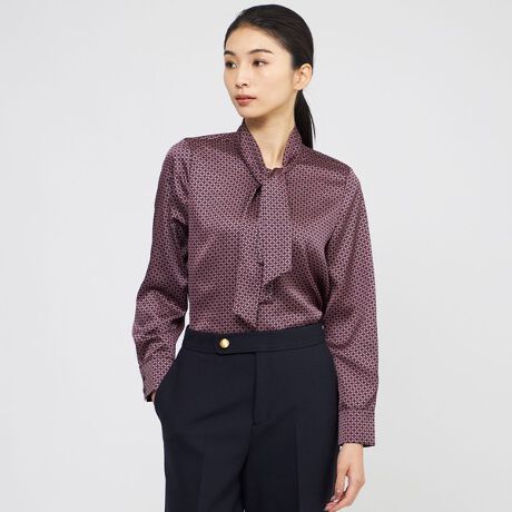 インポート素材ならではの素材感とプリントが上品なボウタイプルオーバーブラウスです。