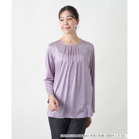 どこか懐かしさを感じさせるレトロ調の柄をプリントしたクルーネックカットソー。ネック周りには放射状に広がるようなタックをあしらい、ドレープ感のある柔らかなニュアンスに。すっきり見えするシルエットには程よくゆとりをもたせ、肩肘張らないリラクシーな着心地を叶えました。バックネックの涙あきはボタンにより開閉が可能。一枚での着こなしはもちろん、ジャケットやコートのインナーとしても活躍するアイテムです。