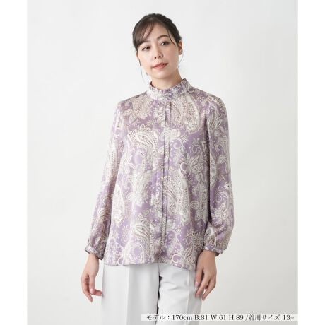 オリエンタル調のペイズリー柄が印象的なスタンドカラーブラウス。繊細な柄のプリントが華やかさを引き立てつつ、落ち着いた大人のエレガンスを感じさせます。巧みに重ねられた生地のディテールが、立体感と奥行きをプラス。ふわりと膨らみを持たせたスリーブラインが優雅な動きを生み出し、着心地の良さとリラクシーな雰囲気を両立。シンプルなシルエットでありながら存在感のあるデザインに仕上がっています。バックファスナーにより開閉が可能。