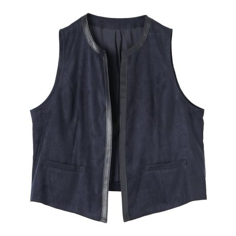 なめらかな肌触りのスエード調生地に、縁取られたレザー調のパイピングが、装いにモダンなコントラストと洗練された印象を与えます。首元からフロントにかけて施されたパイピングは、全体を引き締めるとともに、すっきりとしたV字ラインを強調し、美しい縦のラインを描きます。両サイドに配されたデザイン性の高いポケットが、さりげないアクセントと機能性を兼ね備えています。コンパクトな丈感で、様々なトップスやボトムスとのバランスが取りやすい一着です。
