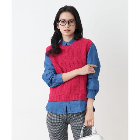 透かしストライプの編み模様がこれからの季節らしい涼やかさを感じさせるニットベスト。コットンをブレンドしたやや薄手のニットで着心地がよく、デイリーに活躍してくれるアイテム。すっきりとしたシルエットで上品かつスマートな佇まいに仕上がります。プレーンなカットソーやブラウスに重ねてコーディネートをアレンジしたい時に最適です。