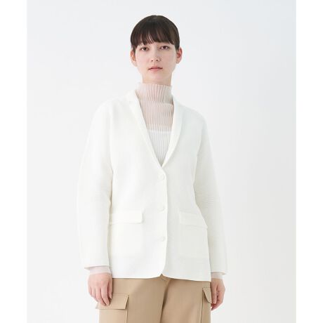 ナローなテーラードカラーをデザインしたニットジャケットです。ニット素材ならではの優しい風合いが際立つアイテムは、きちんと感を演出しつつも女性らしい着こなしと相性バツグン。カーディガン感覚で取り入れるのがオススメです。