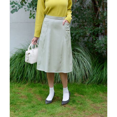 膝丈程度の上品なAラインシルエットでデザインした、クラシカルモダンなフレアスカート。しっかりとした質感の生地には伸縮性があり、肌当たりもよくこれからの季節にぴったり。バックウエストはゴム仕様で心地よくフィットします。両サイドには実用的なポケットをレイアウト。デイリーからオフィス、お呼ばれまで多彩なシーンで活躍してくれそうなアイテムです。バックのホック&ファスナーによりスムーズに着脱が可能。セットアップ対応。