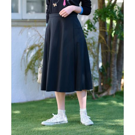 落ち着いたシックな色合いが印象的な、上品なデザインのミディ丈スカート。シンプルながらも美しく広がるAラインシルエットが、女性らしいフェミニンなムードを引き立てます。バックウエストはゴム仕様になっており、フィット感が心地よく、長時間の着用でもストレスフリーなはき心地を実現。ウエスト周りをきれいに見せつつ、リラックス感も兼ね備えたデザインが嬉しいポイントです。生地には程よいストレッチ性を持たせており、動きやすさと快適さをキープします。後ろホック&ファスナーにより開閉が可能。