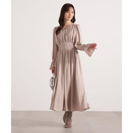フロント釦とウエストシャーリングが特徴のギャザーワンピース。ウエストを引き締めながらメリハリシルエットを叶えます。手元を華奢に見せるキャンディースリーブもアクセント。上品な光沢感のある生地を使用した柔らかい風合いで女性らしさを演出します。無地ベージュとピンク、オリジナルのニュアンスダイヤ柄の3色展開です。