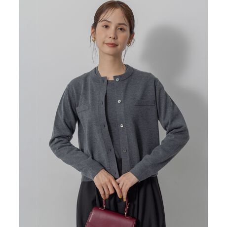 ■デザイン・小さな襟と長すぎない丈がシックでモダンなカーディガン。・首や肩が美しく見える絶妙なバランスと、少し大きめの釦、だましポケットがシンプルなデザインのチャームポイントになっています。・しっかりとした生地なのでダルっとせず好バランスがつくれ、コーディネート次第で様々な表情をみせてくれます。・釦を全部留めてプルオーバーのように着るのもおすすめです。