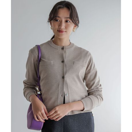 ■デザイン・小さな襟と長すぎない丈がシックでモダンなカーディガン。・首や肩が美しく見える絶妙なバランスと、少し大きめの釦、だましポケットがシンプルなデザインのチャームポイントになっています。・しっかりとした生地なのでダルっとせず好バランスがつくれ、コーディネート次第で様々な表情をみせてくれます。・釦を全部留めてプルオーバーのように着るのもおすすめです。