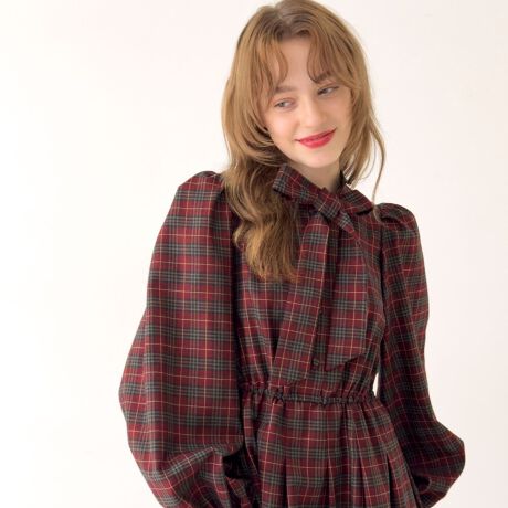 フロントのボウタイがとびきりキャッチーなチェックワンピース