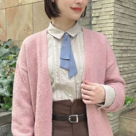 フロントのきらりと光るビジュー釦が上品なタイ付きシャツ。