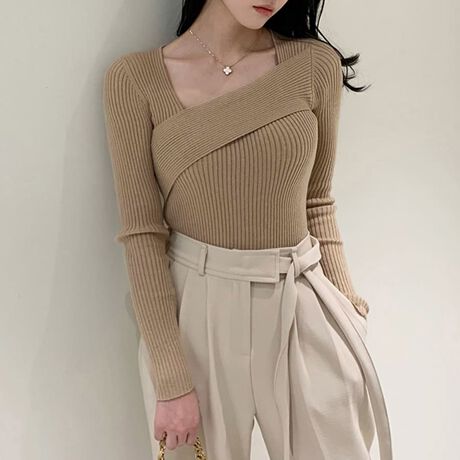 アシンメトリーネックが視線を惹きつける、モードな長袖トップス。