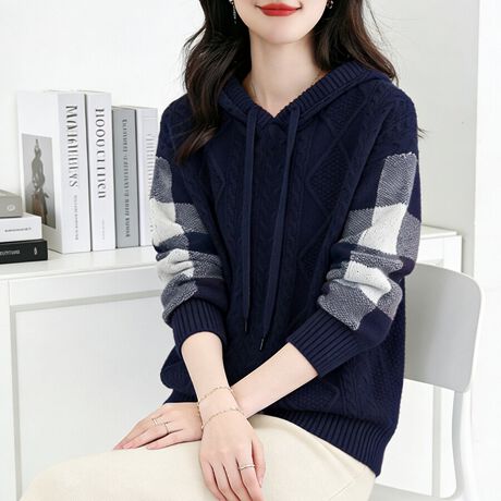 ケーブル編みの立体感とフード付きデザインが魅力の長袖ニット。