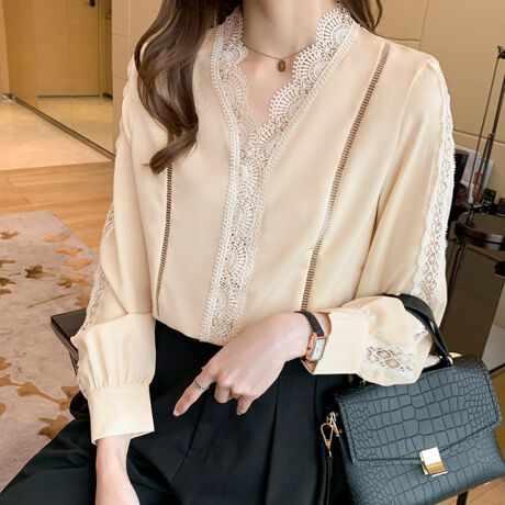 レース切替Vネックサテンブラウス