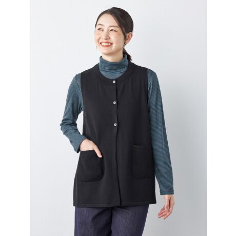 [型番:6250604][型番:6250604]表面にはウールの糸を裏面には綿の糸を使用した暖かなニットベスト。編地を変えたポケットがアクセント。気になるお腹周りをしっかりカバーしてくれるだけでなく暖かさも兼ね備えた69c着丈です。チャコールグレーと黒のベーシックカラーを用意しました。どちらも濃色なので着膨れ感の無いスッキリとした印象に仕上げてくれます。
