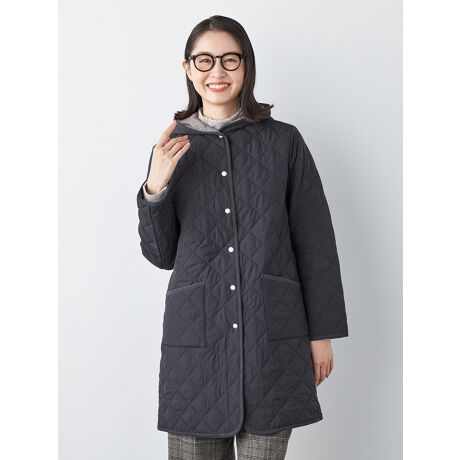 [型番:6250501][型番:6250501]スタンダードなダイヤ柄キルトの中綿フード付きコート。裏地には品のあるクラシックなチェック柄を使用。内側もキルトステッチになっているので滑りがよく、さっと脱ぎ着できます。ベージュとスミクロ、どちらの色もカジュアルな服との相性も良く、重たい印象になりがちな秋冬コーデに、少しの抜け感をプラスしてくれます。撥水加工を施しているのも嬉しいポイントです。