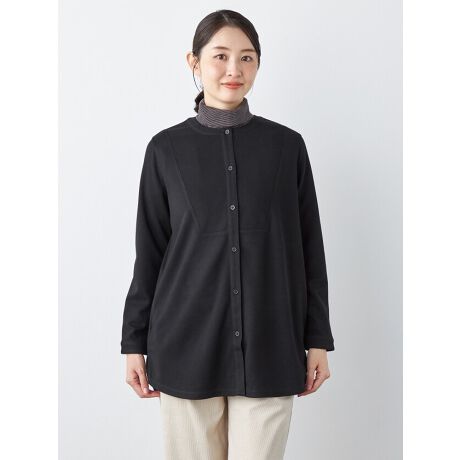 [型番:6250740][型番:6250740]圧縮ウール見えで暖かみのあるジャージー素材の前開きチュニックブラウス。バンドカラー仕様で衿元をすっきりと演出し、適度なゆとりのあるシルエットでボタンを閉じてブラウスのように着用したり、前を開けて羽織のようにもアレンジしたりと巾広くスタイリングが楽しめます。ベーシックなチャコールと黒の2色展開です。