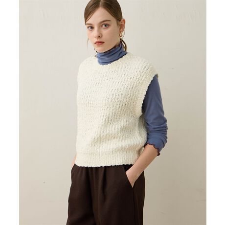 [型番:292142]もこもことしたブークレ素材がやわらかな風合いを放つベスト温かみのあるブークレ素材がシーズンムードを演出するベスト。クルーネックのデザインは、どんなスタイリングにも合わせやすく着回しの幅が広がります。ゆったりとした袖ぐりがレイヤードスタイルに大活躍。お手持ちのシャツやカットソーと組み合わせたコーディネートがおすすめです。