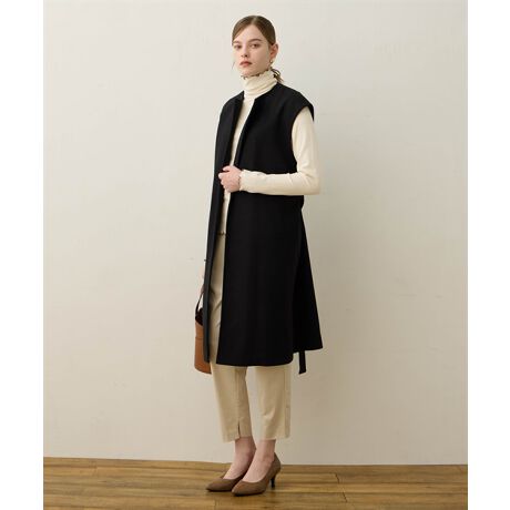 [型番:295087]着こなし自在なサスティナブル素材のフェイクウールジレ昨年好評だったフェイクウールジレに新色が加わりました。ベルトは取り外し可能で、前を開ければラフに、締めればメリハリのある上品なスタイルに。今年からサスティナブル素材を取り入れ、環境にも配慮。パンツにもスカートにも合わせやすく、幅広いシーンで活躍する一枚です。