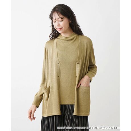 繊細な細番手で編まれたラメ入りのロングカーディガン。裏側はラメが当たりにくくしているので肌触りがよく、ラメが繊細に表現されています。しなやかなとろみと光沢のある素材感と、深めのVネックが上品な初秋向けのカーディガンです。