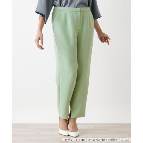 適度にストレッチの効いた、やや薄手のポリエステル生地で仕立てたテーパードシルエットのクロップドパンツ。股上を深めに設定し、程よいリラックス感のあるはき心地を実現しています。すっきりと入ったセンターシームも相俟ってレッグラインをスマートに引き立てます。裾にはスリットを施し、抜け感のあるアクセントに。ミニマルなデザインでトップスともコーディネートしやすく、汎用性に優れた一本です。