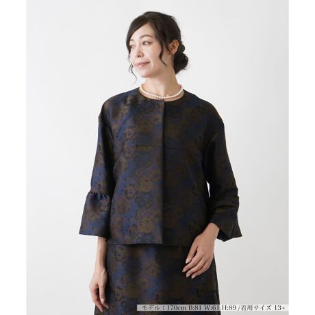 アーティスティックなボタニカル柄が表現されたノーカラージャケット。巧妙なパターンメイクによりレトロシックな趣を感じさせるデザインに。ドロップショルダーでゆとりをもたせつつ、袖口に程よく広がりを作り出したベルスリーブで仕上げ、技ありのニュアンスに。フロント首元のスナップボタンでスムーズに着脱が行えます。お揃いの柄のスカートとのセットアップコーディネートもおすすめです。
