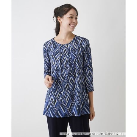 インパクト溢れるグラフィカルな幾何学柄をプリントしたトップス。ネックラインはすっきりと開き、絶妙なバランスの抜け感を演出。タックを施すことでゆとりのある柔らかなシルエットを作り出しています。バックネックの涙あきはボタン開閉が可能。ワイドパンツやミモレスカートとの相性もよく、デイリーからオフィスカジュアルまで多彩なシーンで活躍してくれそうなトップスです。