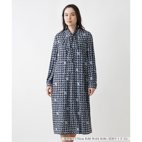 細部にロゴを落とし込んだグラフィカルな総柄プリントが新鮮なインパクトを放つ、ストレッチ素材のバンドカラーシャツワンピース。ミディアム丈で着こなしやすく、程よい軽やかさを感じさせる一枚。ネック周りにタックを施し、立体的なシルエットを作り出しています。ハイウエストで共布ベルトをマークすればメリハリの効いた着こなしに。アンダードレス付きで着心地も快適。足元はパンプスでオーソドックスにまとめるのはもちろん、サンダルを合わせた抜け感のあるスタイルもおすすめです。