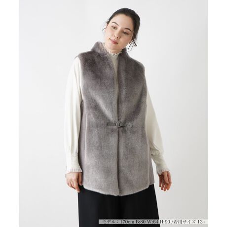 フロント部分を毛並みの揃った美しいフェイクファーで切り替えた、大人の女性らしいラグジュアリーな雰囲気のスタンドカラーベスト。統一感のある落ち着いた色合いでデザインしているので様々なインナーやボトムスとコーディネートしやすく、着回し力に優れたアウターです。すっきりとしたスマートなシルエットで上級者らしいレイヤードスタイルが手軽に楽しめる一着です。前立てはベルトにより開閉が可能。