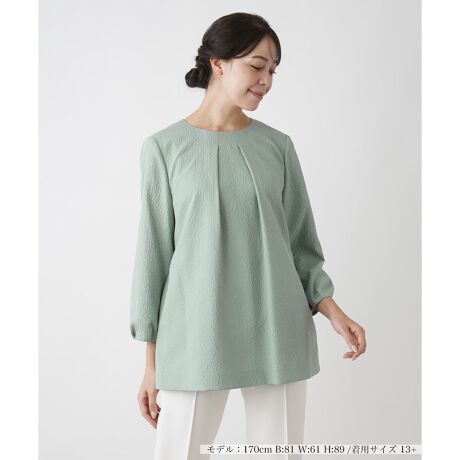 表面に凹凸のあるファブリックが特徴のクルーネックプルオーバー。ネック周りにタックを施すことで立体的なシルエットを作り出しています。袖は程よくゆとりをもたせ、リラックス感溢れる着心地を叶えました。ヒップまで隠れる程度の丈感なのでナチュラルに体型カバーできるのも嬉しいポイント。ベーシックなワイドパンツでまとめるのはもちろん、ミモレスカートを合わせたフェミニンなコーディネートもおすすめです。背中のファスナーで開閉が可能です。