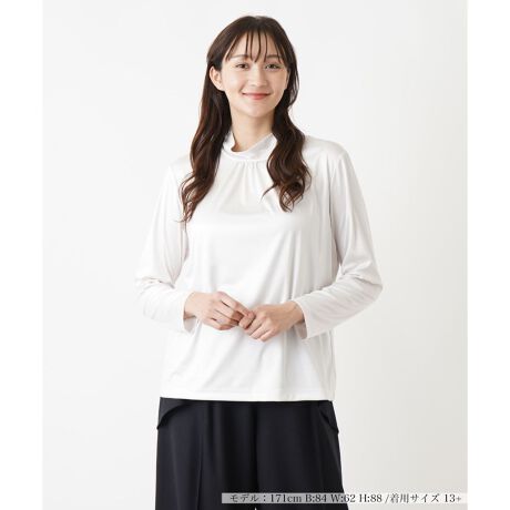 肌触りのよい滑らかな薄手のファブリックで仕立てた、ハイネックカットソー。程よいストレッチ性が快適な着心地を実現し、長時間の着用でもストレスフリーに過ごせます。ネック周りには繊細なギャザーが施され、ドレープが柔らかなニュアンスを生み出し、フェミニンムードを漂わせます。すっきりとしたシルエットが身体のラインを美しく引き立て、スマートな印象を演出。シンプルな無地で様々なボトムスとバランスよく合わせられるアイテムです。