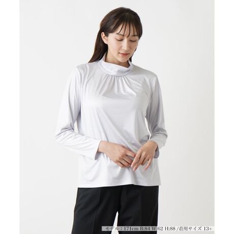 肌触りのよい滑らかな薄手のファブリックで仕立てた、ハイネックカットソー。程よいストレッチ性が快適な着心地を実現し、長時間の着用でもストレスフリーに過ごせます。ネック周りには繊細なギャザーが施され、ドレープが柔らかなニュアンスを生み出し、フェミニンムードを漂わせます。すっきりとしたシルエットが身体のラインを美しく引き立て、スマートな印象を演出。シンプルな無地で様々なボトムスとバランスよく合わせられるアイテムです。